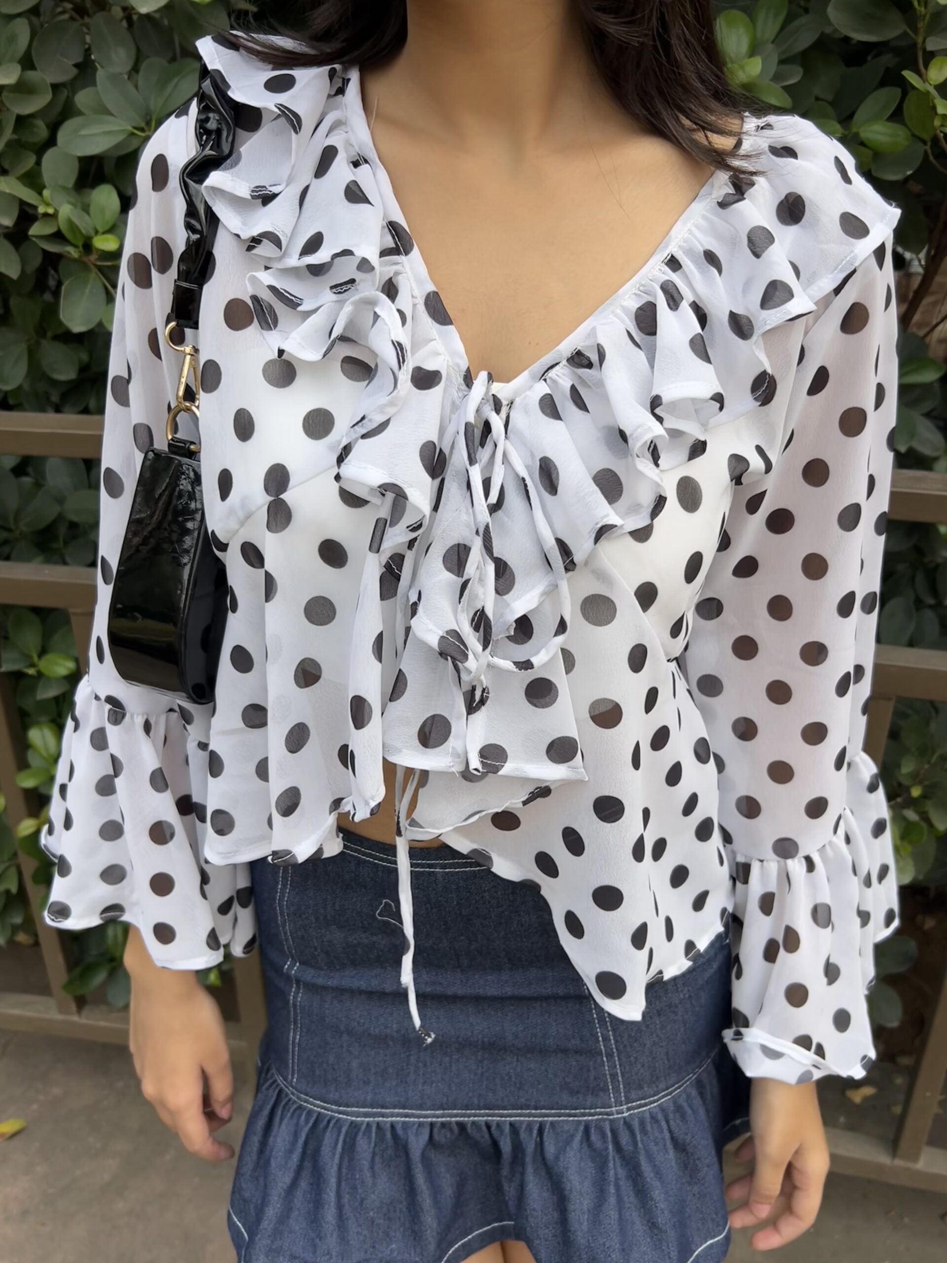 cute polka dot ruffle top made with georgette polka dot print fabric . Has a loose fit with ruffles all around.